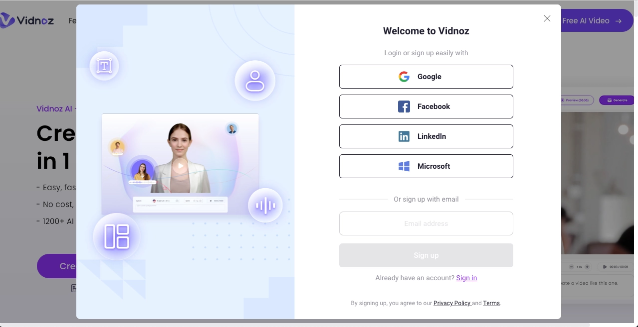 Go to Vidnoz: Check out Vidnoz AI Video Generator and click on “create free AI Video” option.