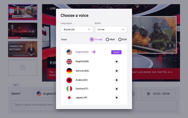 Add AI Voiceover: You can also choose the voiceover from Vidnoz database.