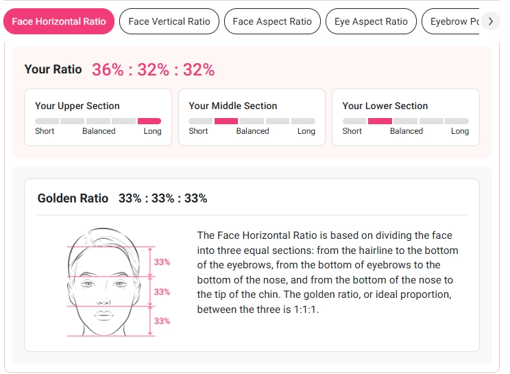 PerfectCrop AI face analyzer can help you do comprehensive facial analysis with photos. Following the Rules of Thirds, this online 1/3 face ratio filter aims to visualize your face details, such as horizontal face ratio, vertical ratio, and other facial feature ratios.