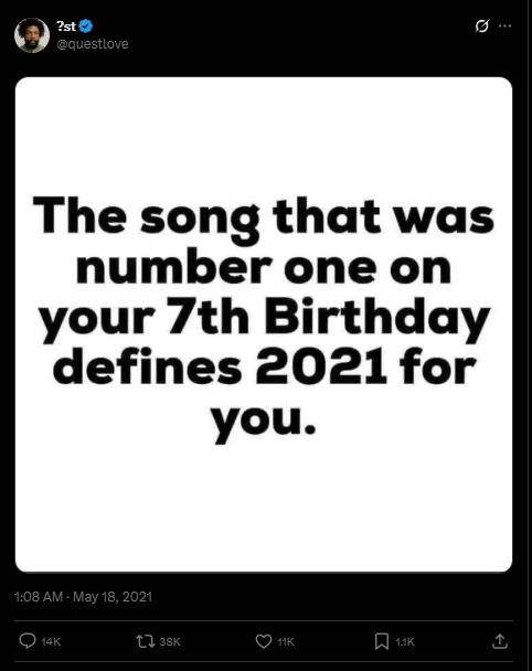 A twitter user Questlove’s playful tweet is a perfect example of how people connect hit songs with personal life: