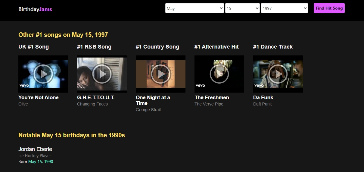 Just fill in your birth date, then various popular songs will be displayed as YouTube videos. You can find various hit songs in different genres, and you can enjoy them on the page directly.