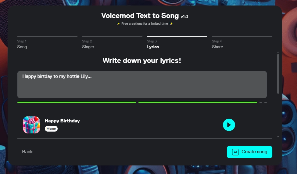 On your birthday, wouldn't you want to add some wishes to your prayers? It's certainly a good idea to combine your birthday songs with lyrics containing your best wishes. Who knows, maybe your wish will come true when people sing it. Then you can try Voicemod AI text-to-song feature.