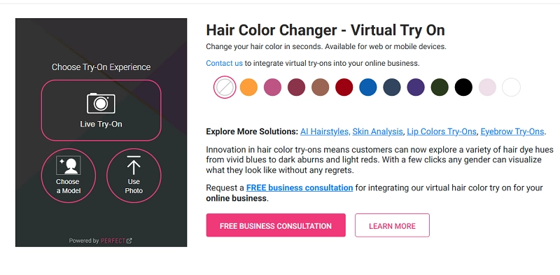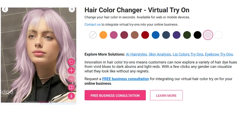 Perfectcorp online hair color tester is a web-based solution powered by AI that helps you change your hair color in a few seconds. You can use this tool to explore and visualize various hair colors without having to download an app. All you have to do is upload a photo, choose a digital mode, or use your live camera for real-time color previews.