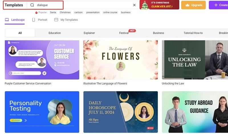 - Preset HQ Dialogue Video Templates. More than 2800 video templates are provided, covering different scenarios and topics, such as news reports, education, social media, etc. You can edit the templates directly to improve your creation efficiency.