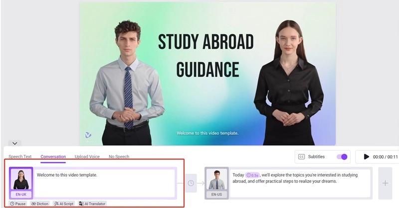 Step 2: You can enter the scripts in the text boxes and adjust the digital humans’ voice, and language and add pause in their conversation.