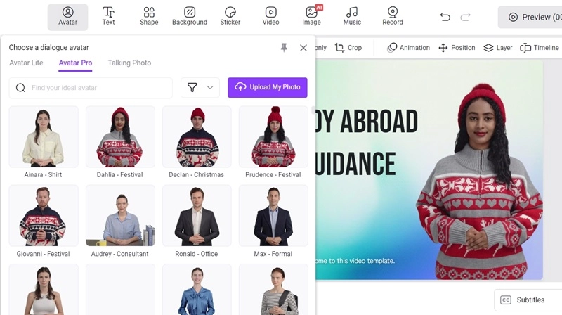 Step 3: To change the avatar, you can hit the “Avatar” in the top bar to choose a preferred one. You can also upload your own photos. The talking image ai technology will turn it into videos.