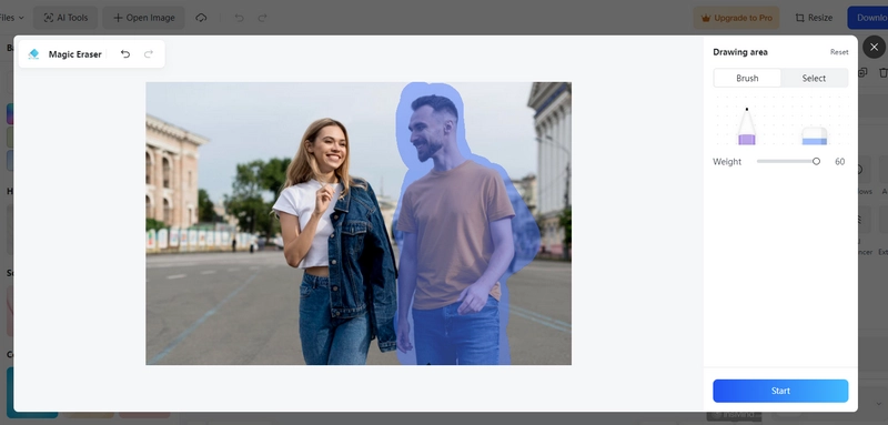 Step 3. It will direct you to the photo editing page. On the new page, hold down the left mouse button and move to brush the person you want to crop out. When you’re ready, click Start to delete the person.