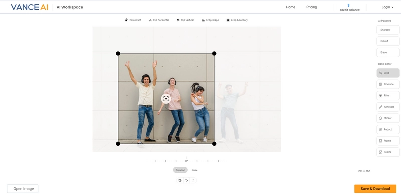 Step 4. After you have decided the area, click Save & Download. VanceAI serves as a free image cropper with no sign-up and watermark.