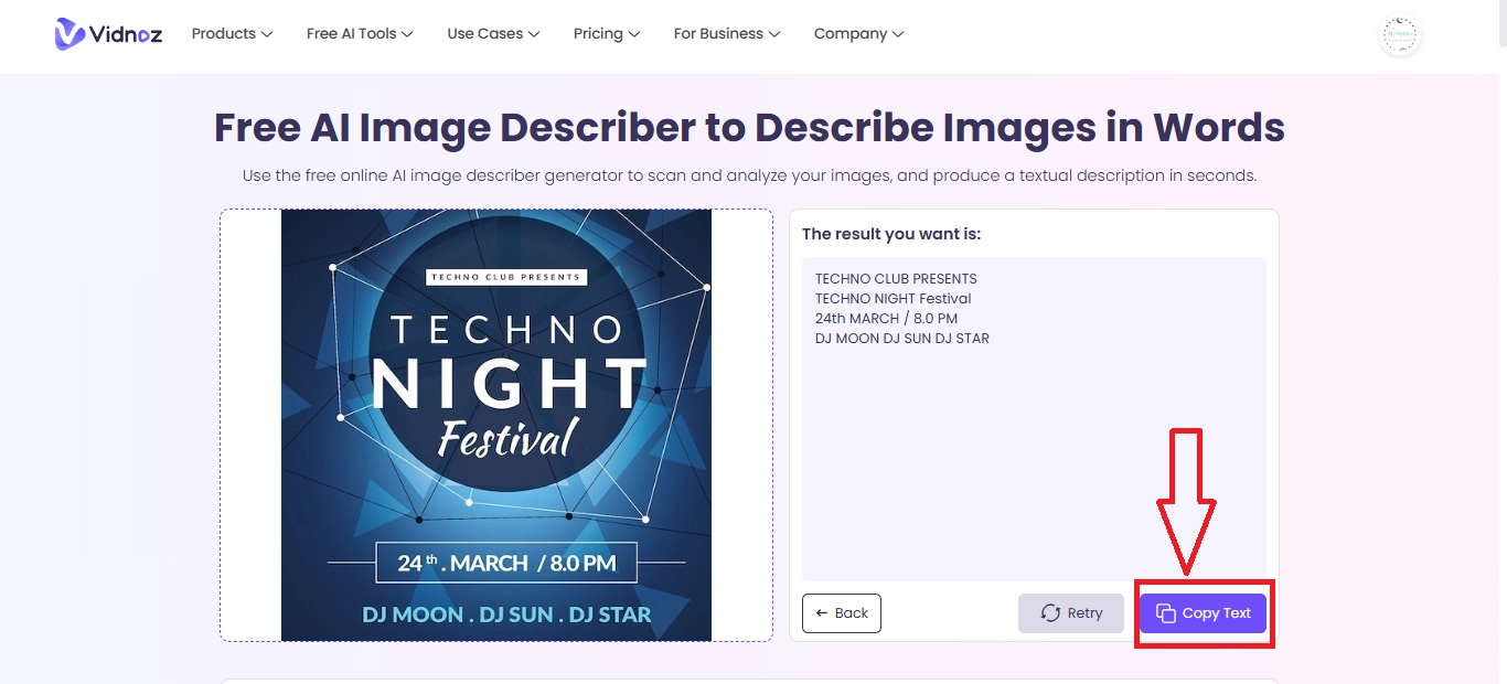 As found earlier, Vidnoz AI has emerged as the best tool to quickly extract text from images. This AI image describe tool recognizes text from any image, like screenshots, scanned documents, or signs. You can turn menus, tables, and more into editable text in seconds without typing it all by hand.