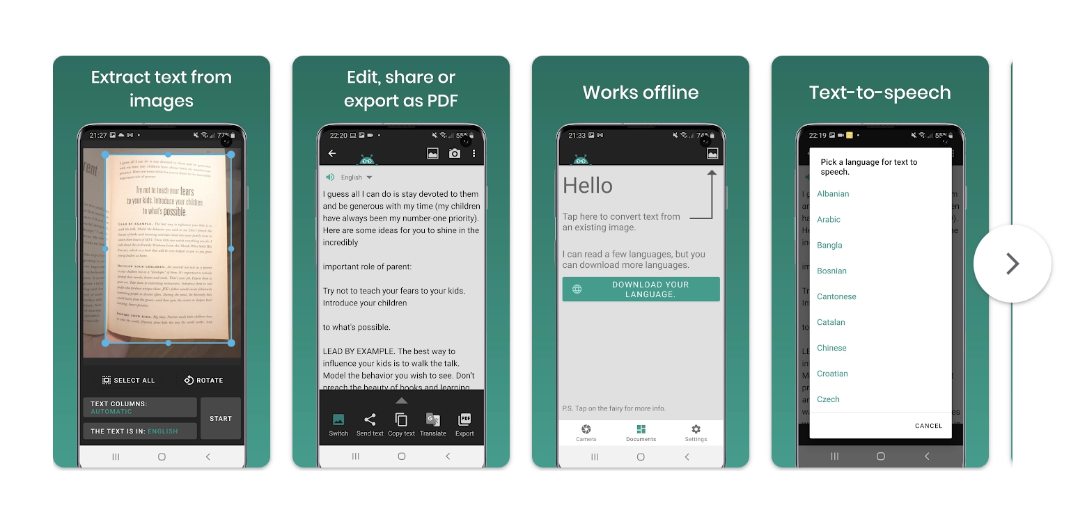 - Text-to-speech option: There is a text to speech option in which you can listen to the text after it’s extracted, which helps learn or check.