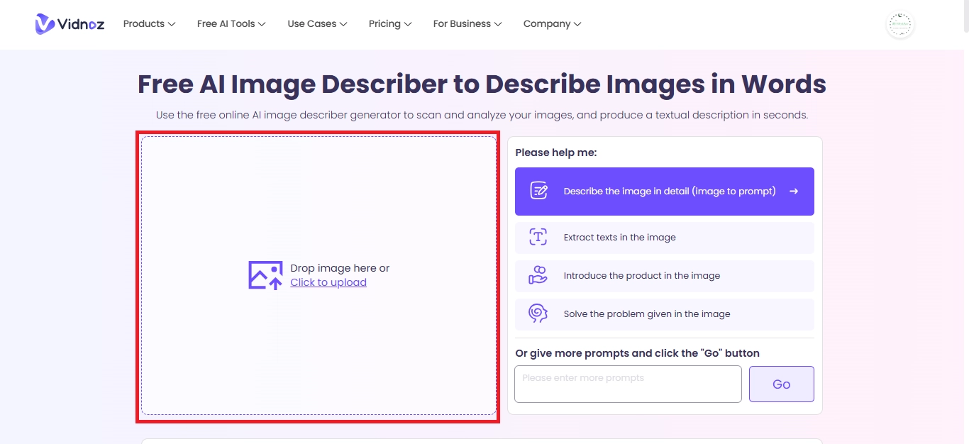 Step 1: Open Vidnoz AI Free AI Image Describer tool in your browser and upload your image.