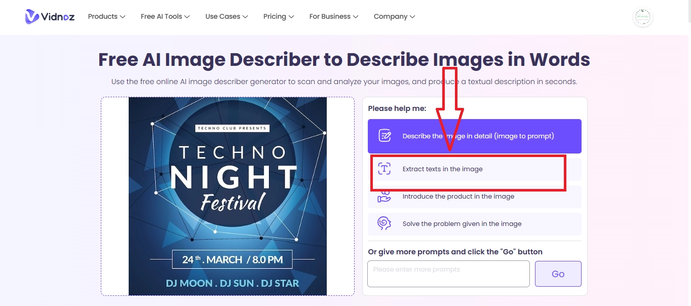 - Image creation: You may use Vidnoz text to image generator if you want to create an image from the extracted text as a prompt.