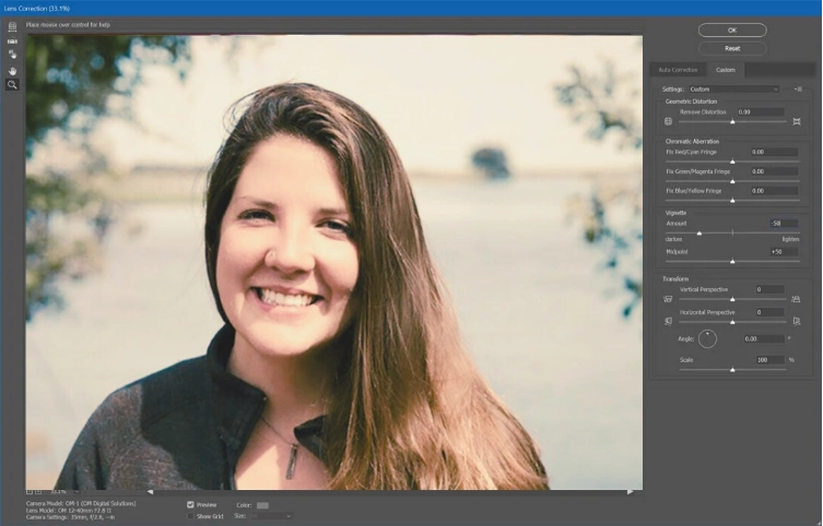 Film photos often have a soft vignette around the edges. To add this, go to Filter > Lens Correction, adjusting the vignette settings until you get a smooth fade around your photo’s corners.
