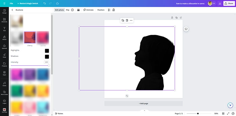 Step 2. Go to Effects > Duotone > Cherry > Highlights, and choose black for color and shadow options. Adjust the intensity if desired.