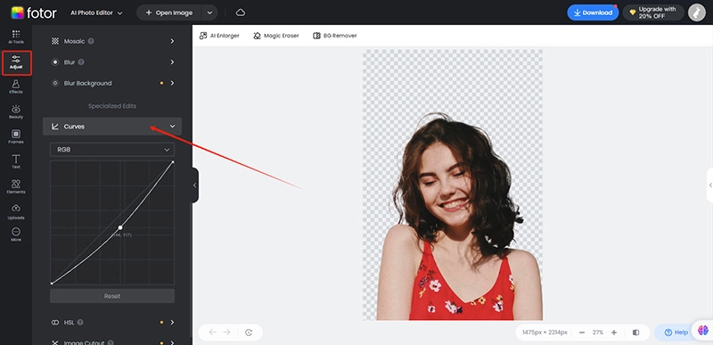 Step 1. Head to Fotor and upload your photo. Remove your photo's background by clicking on the BG Remover Feature.