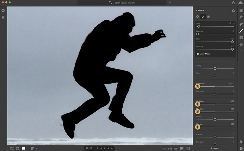 Step 2: Darken the subject and make a silhouette with the edit sliders. Adjust the sliders to lower the exposure, highlights, shadows, and blacks.