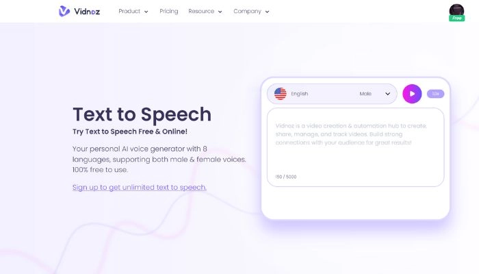 Vidnoz Text to Speech is free to use and allows you to convert written text to speech online. It offers AI speech in eight languages in both male and female voices.
