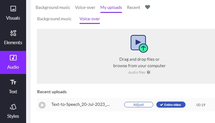After uploading the video, add the voice you generated through Vidnoz text to the speech tool. Follow the steps given below in order to do so: