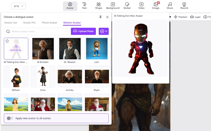 It helps you to make ironman-themed videos quickly with structured video templates. You can add cool visual or sound effects on your iron man creations. It’s simple, smooth, and kind of magical how easily your iron man avatars can be turned into dynamic, talking avatars. It’s like the classic line in the Iron Man movie - "Tony Stark has a heart."
