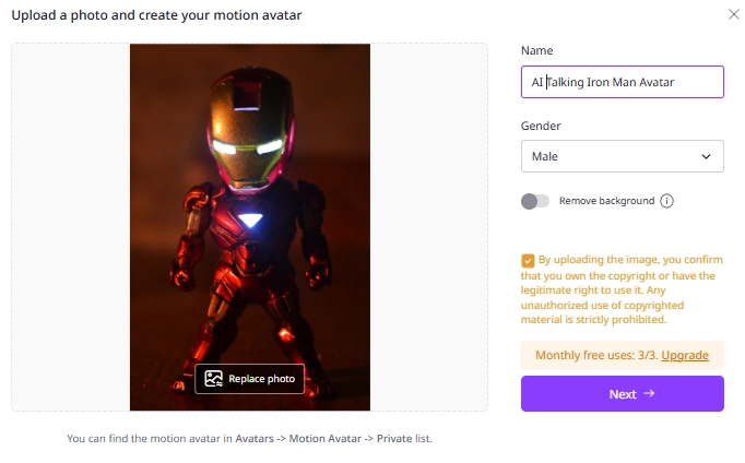 Now that you’ve got a collection of iron man avatars, why just put them in your archives? Come on, I believe that you want to see them move and even talk to you. Activating them and making engaging videos is such a great idea, and with Vidnoz AI, you can breathe life into them easily.