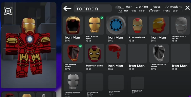 Step 3.Purchase and equip these items in the Avatar Editor to assemble your Iron Man avatar in Roblox;