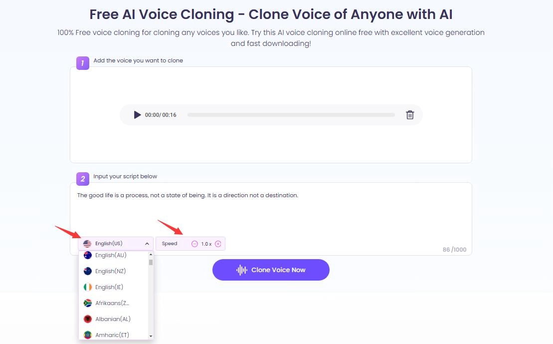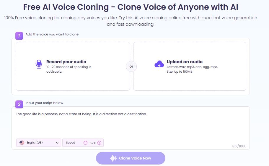 Step 2: In the next section, record a kid voice or upload an kid audio you want to change. Type in the text you want the AI kid voice to read out. You can further customize the voiceover to your choice of language, i.e., Portuguese, German, Arabic, Chinese, Italian, Korean, and more. Once you are done, click Clone Voice Now.