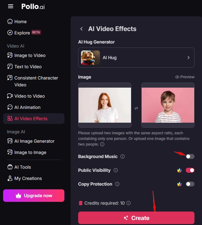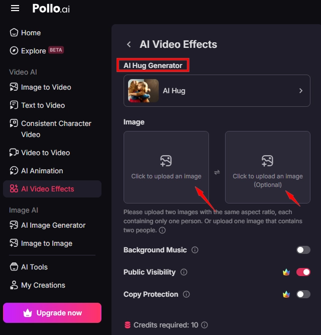 Step 1. Visit and log into the Pollo AI hug site, click to upload your photos.