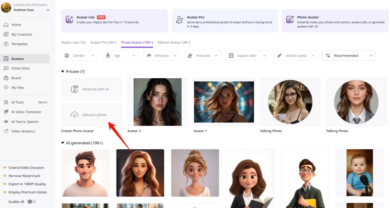 When you've completed step 2 and have uploaded a photo or the custom Avatar Lite has been generated, you can select it to create a video.