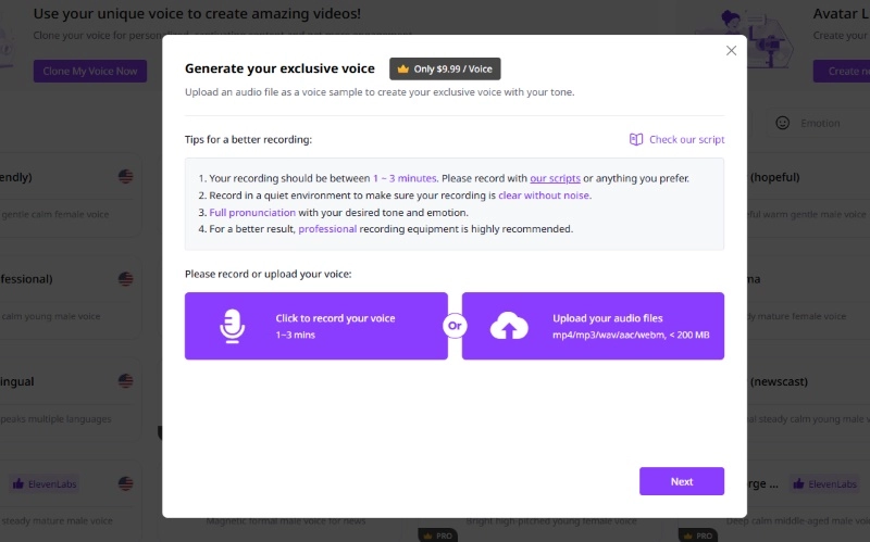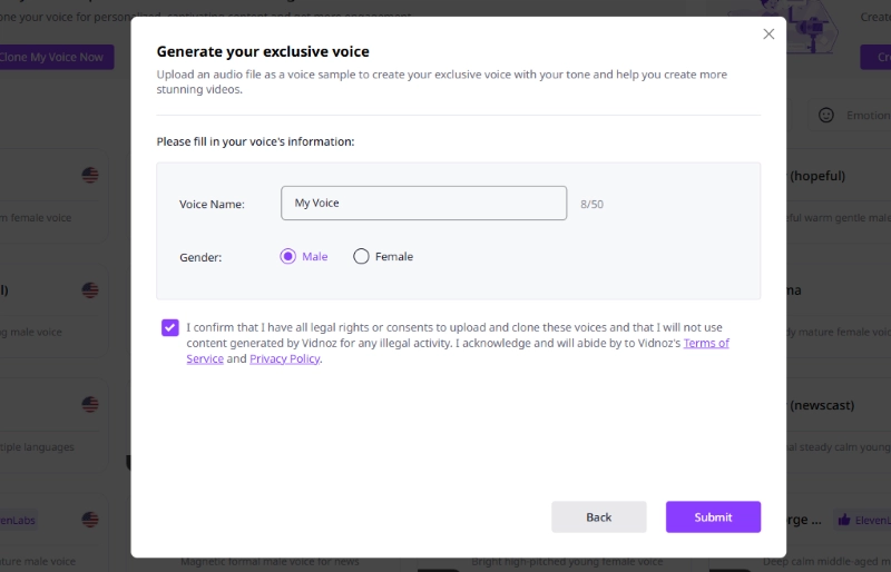 Step 4: Fill in your voice's information. Then, follow the instructions in the pop-up window to finish the subsequent operations and pay. Vidnoz will then automatically train a realistic AI voice model based on the recordings you upload. You can use it when creating videos.