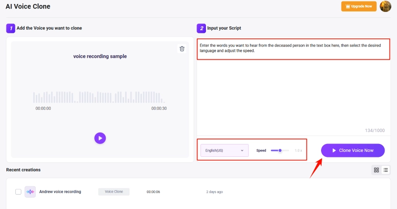 Step 3: In the operation area, upload your pre-prepared audio file of the deceased. Once uploaded, enter the words you want to hear from the deceased person in the text box on the right, then select the desired language and adjust the speed. When everything is ready, click the Clone Voice Now button to directly start your free AI voice cloning of deceased person.