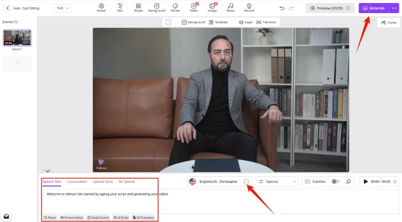 Customizing the speech text and fine-tuning parameters such as speed, pauses, etc. may also be needed to make the avatar's voice more realistic. Then, Vidnoz's AI lip-sync technology can render your AI video of dead person with matching lip-sync.