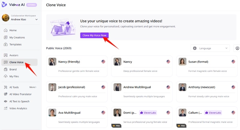 Step 2: Click the link here to enter the Vidnoz AI Voice hub. Then, select the AI Voice Clone tab in the left sidebar.