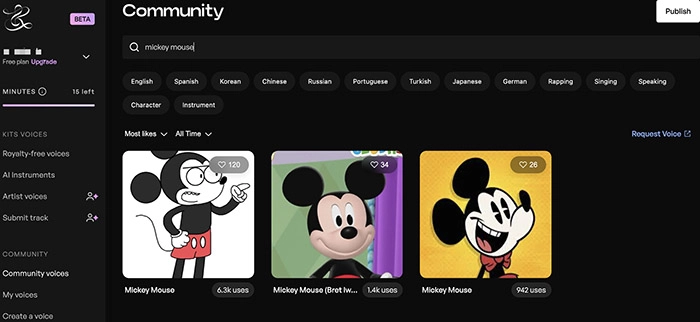 Step 2. Navigate to Community Voices. Search for Mickey Mouse’s voices by name.