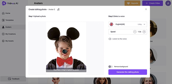 Step 2. In the library, go to Avatars > Upload your photo. Select the voice and speed, and click on the Generate this talking photo button.