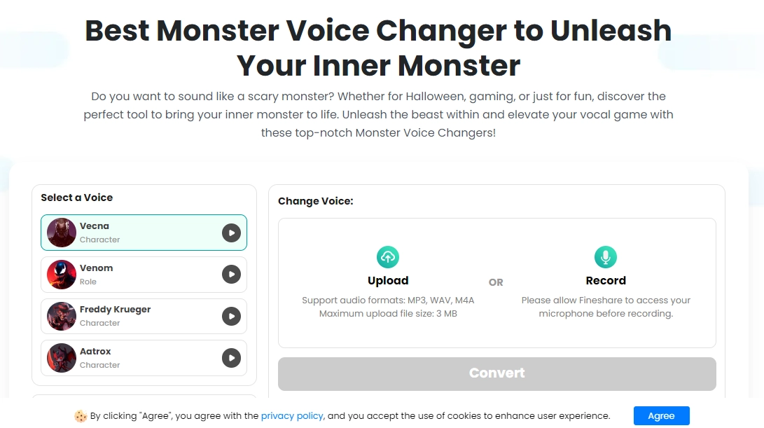 Finshare is a sound-to-sound monster voice converter. You can find many monster sounds, then you can record your voice or upload an audio file for the monster voice transformation. It is suitable for podcasts and voiceover recordings due to its studio-quality monster voice changes.