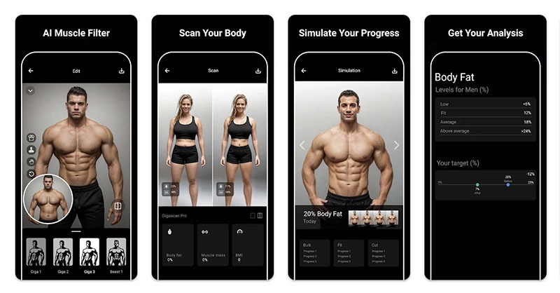 GigaBody is a muscle photo editor app free to use on Android and iOS. You can visualize your muscle growth potential, preview your lean physique, and see yourself at lower body fat levels with its AI muscle filters. The fake muscle app is somehow like a body shape calculator. It can even calculate your body metrics and track body fat and muscle mass based on your photo only.