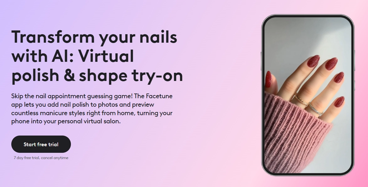 Facetune, an AI photo retouching tool, offers an AI-powered manicure style feature that allows you to easily change the color of your nails according to the ideas you provide. This nail color changing app is very easy to change nail colors- upload your own nail photo and tell the system what kind of manicure you need. Finally, it will help you try-on proper nail colors quickly and accurately.