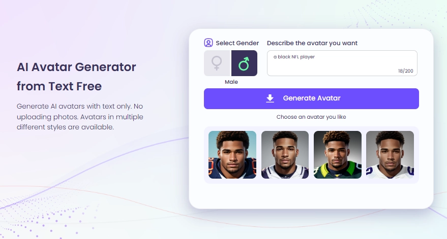 This is the best choice if you need original NFL avatars. The AI avatar generator allows you to personalize avatars in various styles like realistic, anime, or even 3D!