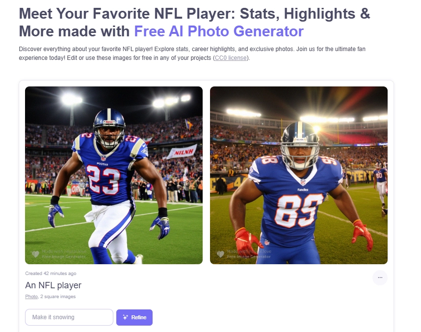Think of some creative prompts, like “a powerful football player with a fierce look” or “a cheerful NFL fan in a team jersey” can lead you to the perfect NFL avatar generations.