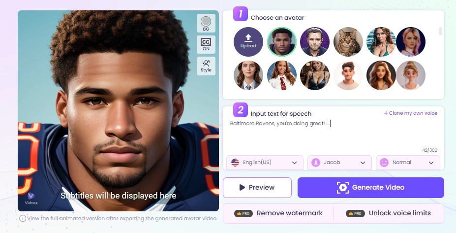 Jump to the page, upload your NFL avatar. You can customize the speech content, language, AI voice model, and even the emotions!