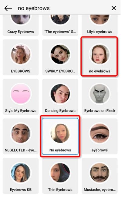 Step 2. Search for the “No Eyebrow” face filter.