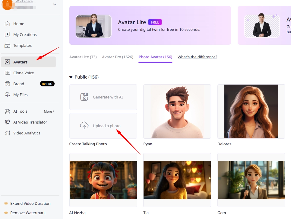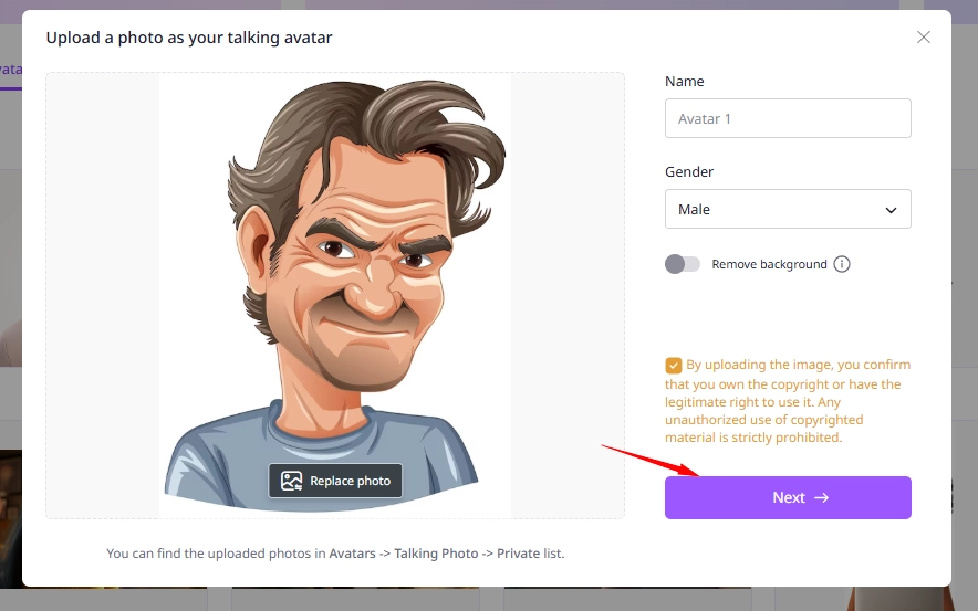 Step 2. In the library, go to Avatars > Upload your photo to upload your caricature.