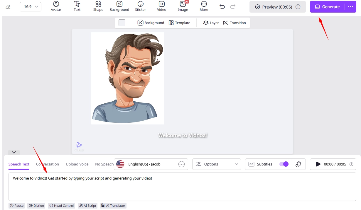 Step 4. Input the text that needs to be converted to audio. Click on the Generate button to generate an AI talking head free.