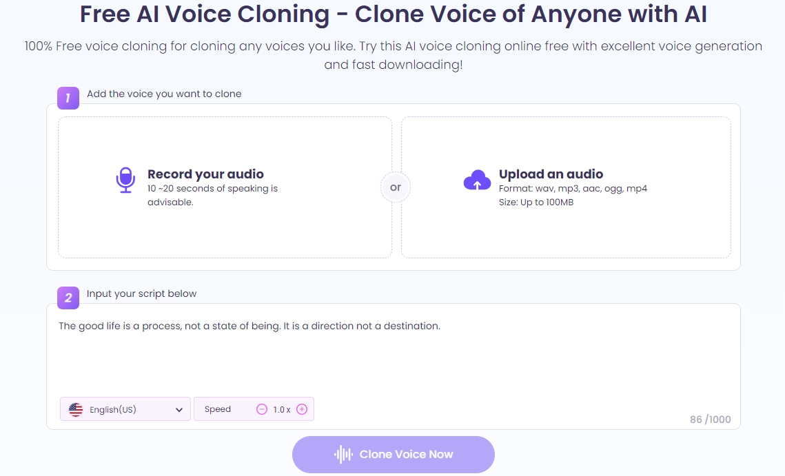 Step 3. Here, record your audio, upload an audio file, or enter the text, select a language, adjust the pitch and speed, and click on “Clone Voice Now”.