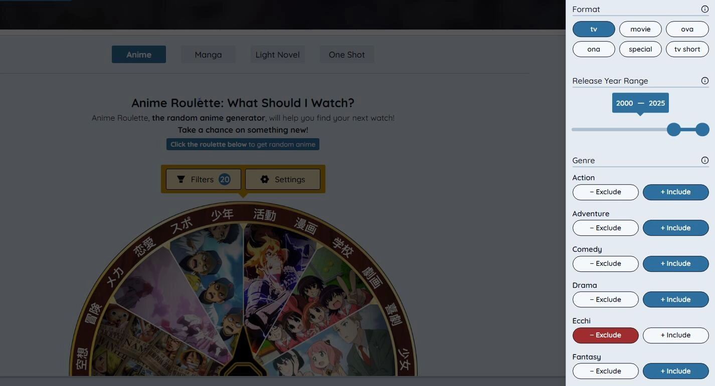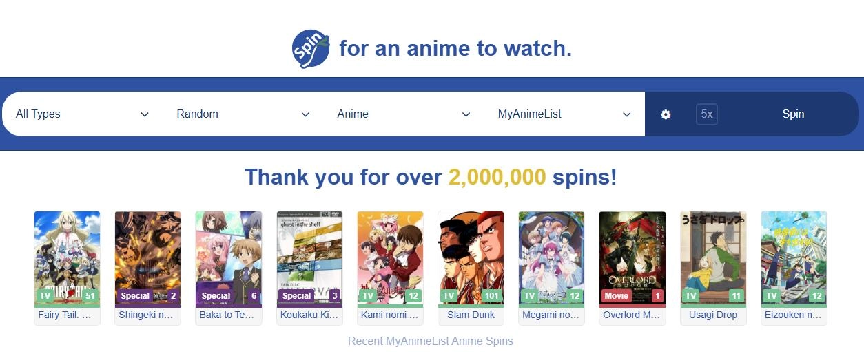 Spin.moe is another ideal random anime show generator that many anime lovers like and recommend. It pulls from MyAnimeList, Anilist, as well as the Kitsu database. In this case, you might spin and dig out some pearls covered with dust.