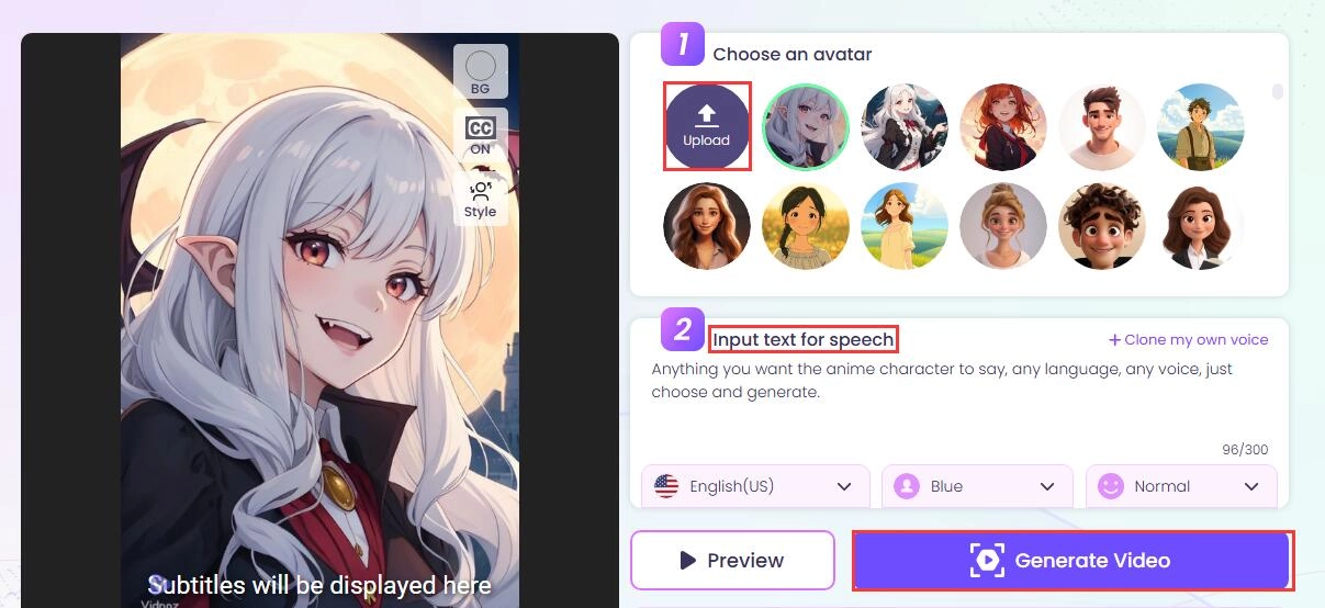 Step 3. Choose from the stock avatars or upload your own loved anime girls and boys > input the script you want them to say > choose voices > Generate Video.