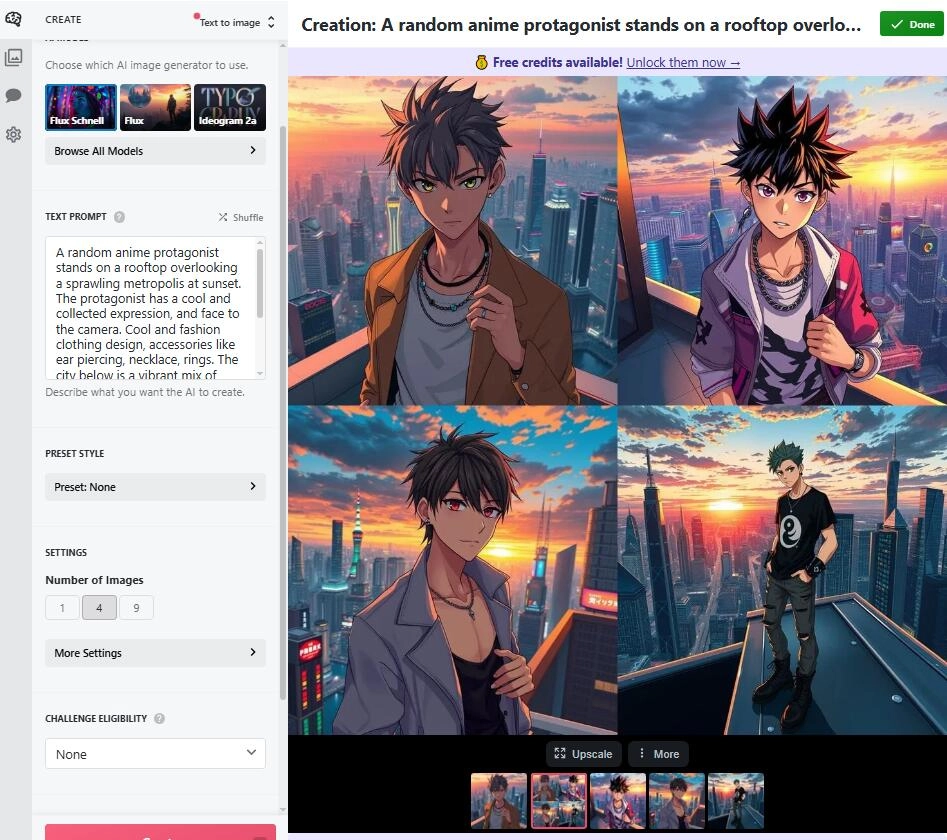 This free anime avatar maker creates 4 1:1 square avatars in a go from text prompts. You may just input what kind of style, coloring, clothing, background, vibe, and more you want, and in 1 click, you will get a group of anime avatars in different styles. Targeting a specific style, you may also click regenerate to get 4 more avatars in your preferred style.