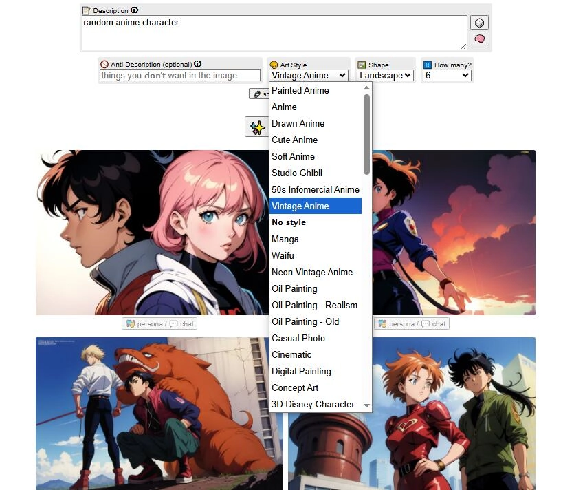 Perchance is a platform that comes with generators of all types, including image generators, video generators, text title generators, etc. One of its most popular generators is the AI random anime generator, in which diverse anime styles are provided: soft anime, vintage anime, 50s infomercial anime, manga, and also Studio Ghibli style and more.