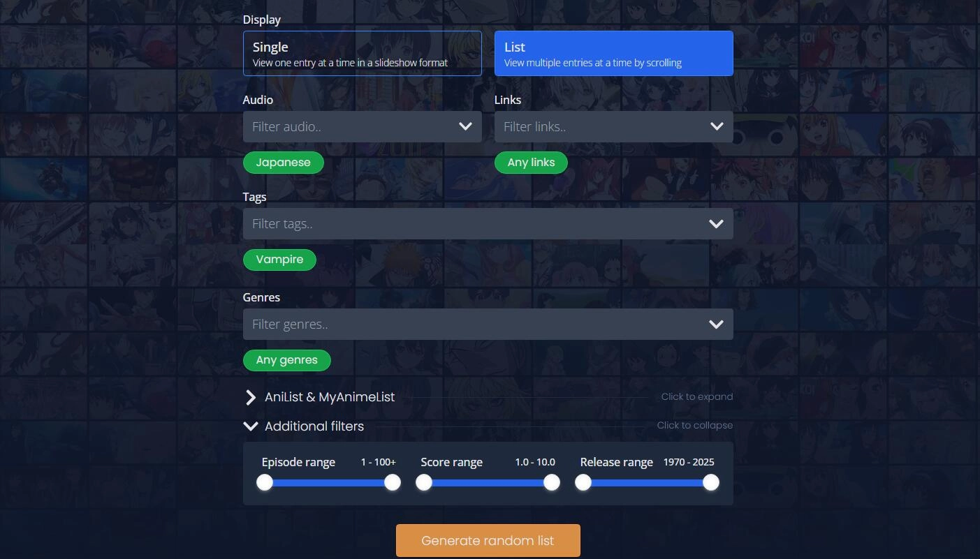 RandomAnime.org will be a great helper that comes with not only a single anime recommendation, but also a list that applies to your filters. It provides must-have filters like Audio (caption), Links (platforms), Tags, Genres, Database, etc. Helpfully, its extremely detailed tags will never let you down: whatever topics you like, there will be one.