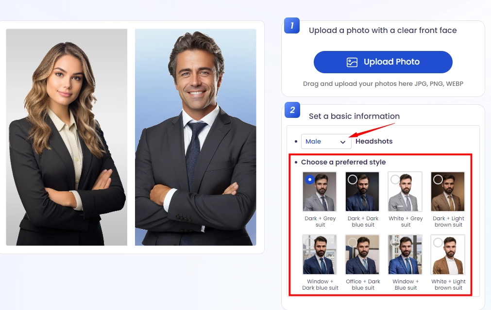 Step 2. Choose the gender of your AI headshot, and pick a preferred style based on the position you’re applying for, your skin and other features to get a precise headshot.